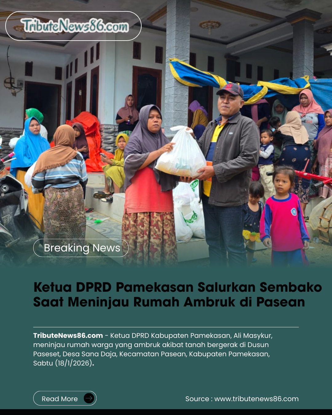 TributeNews86.com – Ketua DPRD Kabupaten Pamekasan, Ali Masykur, meninjau rumah warga yang ambruk akibat tanah bergerak di Dusun Paseset, Desa Sana Daja, Kecamatan Pasean, Kabupaten Pamekasan, Minggu (18/1/2026).