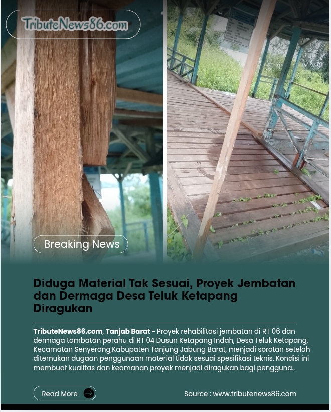 TributeNews86.com, Tanjab Barat – Proyek rehabilitasi jembatan di RT 06 dan dermaga tambatan perahu di RT 04 Dusun Ketapang Indah, Desa Teluk Ketapang, Kecamatan Senyerang,Kabupaten Tanjung Jabung Barat, menjadi sorotan setelah ditemukan dugaan penggunaan material tidak sesuai spesifikasi teknis. Kondisi ini membuat kualitas dan keamanan proyek menjadi diragukan bagi pengguna.