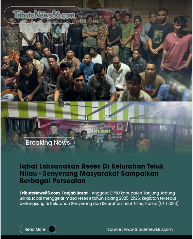 TributeNews86.com, Tanjab Barat – Anggota DPRD kabupaten Tanjung Jabung Barat, Iqbal menggelar masa reses II tahun sidang 2025-2026, kegiatan tersebut berlangsung di Kelurahan Senyerang dan Kelurahan Teluk Nilau, Kamis (5/1/2026).