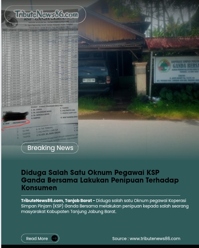 TributeNews86.com, Tanjab Barat – Diduga salah satu Oknum pegawai Koperasi Simpan Pinjam (KSP) Ganda Bersama melakukan penipuan kepada salah seorang masyarakat Kabupaten Tanjung Jabung Barat.